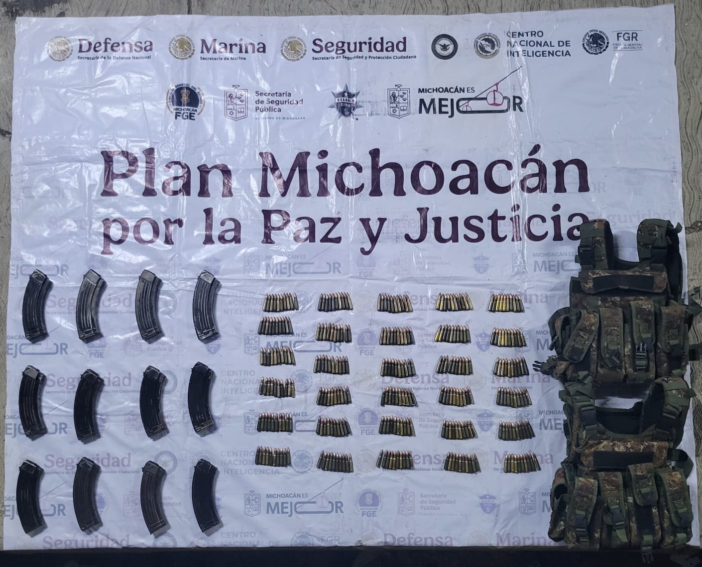 Buenavista, Michoacán, 29 de enero de 2026.- Como resultado de una acción operativa y estratégica, elementos de las secretarías de Seguridad Pública (SSP) y de la Defensa Nacional (Defensa) aseguraron 300 cartuchos útiles, 12 cargadores y equipo balístico en el municipio de Buenavista.