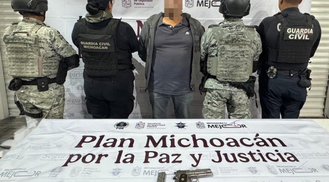 Morelia, Michoacán, 20 de noviembre de 2025.- Elementos de la Secretaría de Seguridad Pública (SSP), y de la Guardia Nacional (GN), detuvieron en la ciudad de Morelia a una persona armada, producto de las labores del Plan Paricutín. Durante el desarrollo de patrullajes de vigilancia en la calle Sentimientos de la Nación en la tenencia […]
