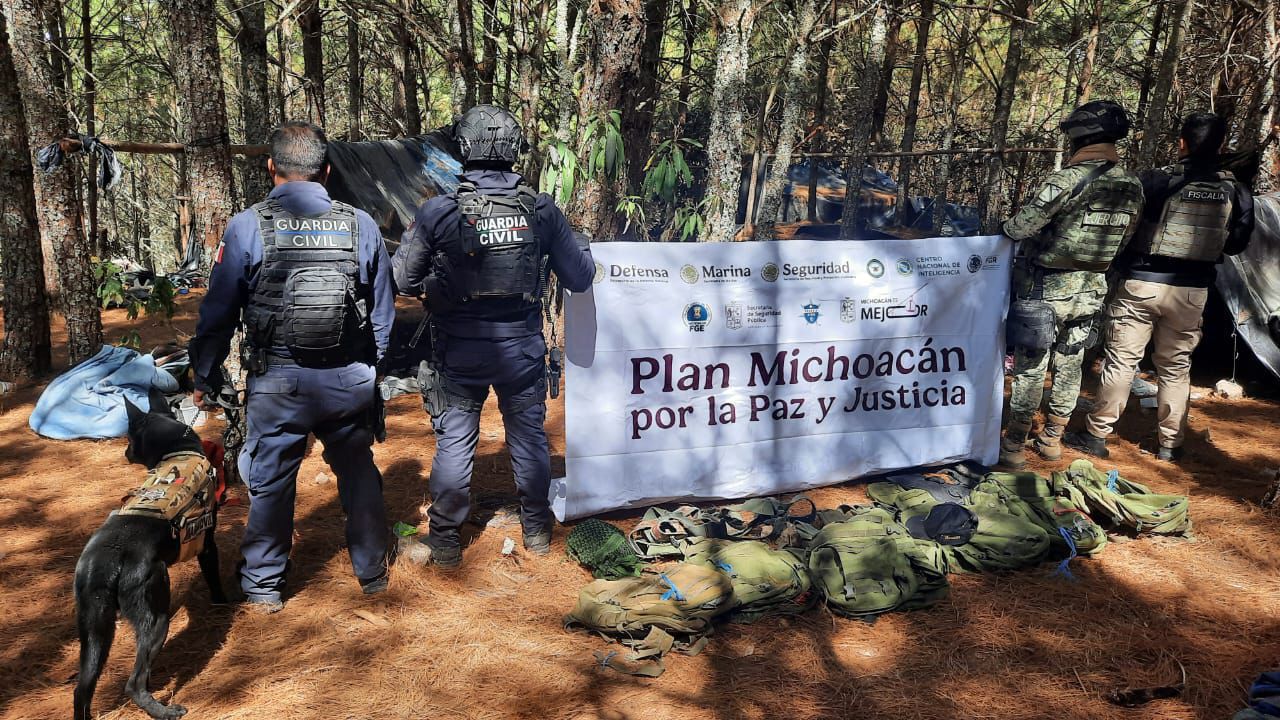 Queréndaro, Michoacán, 28 de febrero de 2026.- Como parte de las estrategias del Plan Michoacán por la Paz y la Justicia, elementos de la Secretaría de Seguridad Pública (SSP), en coordinación con la Secretaría de la Defensa Nacional (Defensa) y la Fiscalía General del Estado (FGE), localizaron y desmantelaron un asentamiento provisional presuntamente utilizado para actividades ilícitas en una zona serrana de este municipio.