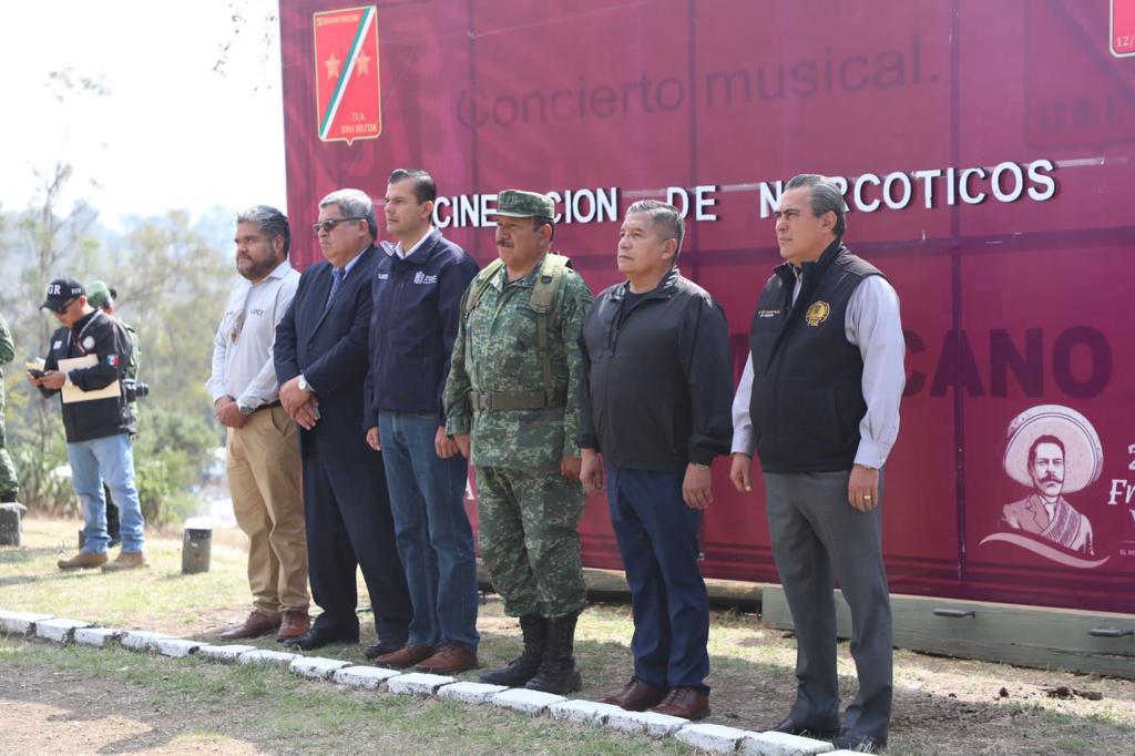 En representación del gobernador Alfredo Ramírez Bedolla, Ortega Reyes constató sobre la destrucción de narcóticos decomisados como resultado de las acciones efectuadas de manera coordinada entre el Ejército Mexicano, Guardias Nacional y Civil así como autoridades federales y municipales, a lo largo y ancho del territorio estatal.