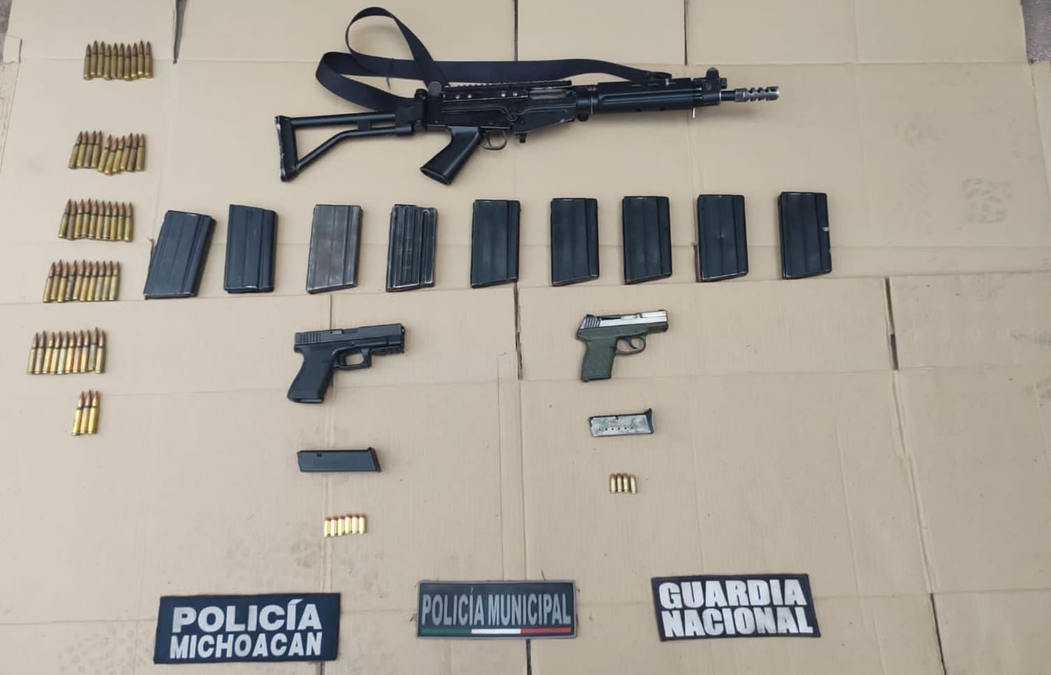 Tras un reporte donde se alertó sobre detonaciones de arma de fuego, los agentes de las policías Michoacán y Municipal, así como de la GN, intensificaron labores, lo que derivó en la ubicación de dos hombres a bordo de una unidad de la marca Chevrolet, en la cual observaron a simple vista armas de fuego.