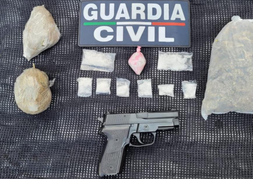 Dentro de sus pertenencias al masculino le fueron localizados nueve envoltorios con sustancia granulosa, con las características propias de la metanfetamina, más de 370 gramos de hierba verde y seca, al parecer marihuana, y una réplica de un arma de fuego. Por lo anterior, se procedió a presentar al detenido y lo decomisado ante la autoridad encargada de determinar su situación jurídica con base en la Ley.