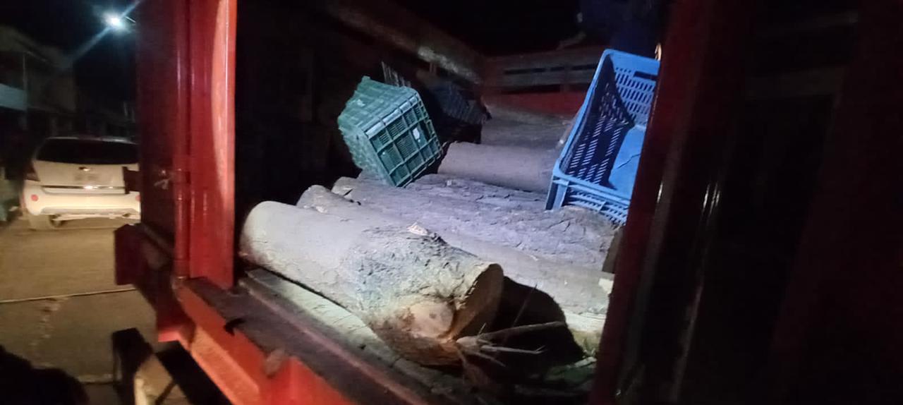 En el interior de la caja de carga, localizaron cerca de 23 piezas de madera cortadas en rollo, por lo que se deduce fueron cortadas de forma ilícita; por ello, se procedió a asegurar la unidad junto a la materia prima decomisada, para ponerlos a disposición de la autoridad competente, a fin de llevar a cabo las diligencias correspondientes.