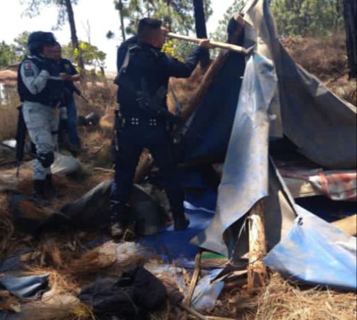 Momentos después, los agentes de las Guardias Civil y Nacional, junto con la FGE; verificaron se trataba de un campamento clandestino, presuntamente utilizado por integrantes de una célula delincuencial, por lo que procedieron a desmantelarlo e incinerarlo, para posteriormente desplegar acciones policiales en el área, en búsqueda de los responsables.