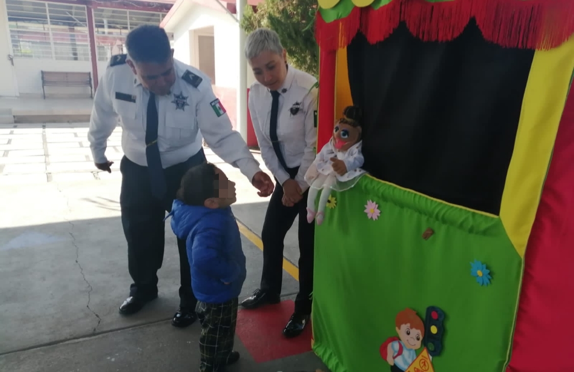 Morelia, Michoacán, 18 de enero del 2023.- Como parte de los programas de proximidad social para el acercamiento con integrantes de todas las edades de la población, los agentes de la Secretaría de Seguridad Pública (SSP), llevaron un taller de educación vial a niñas y niños de preescolar, en Morelia.