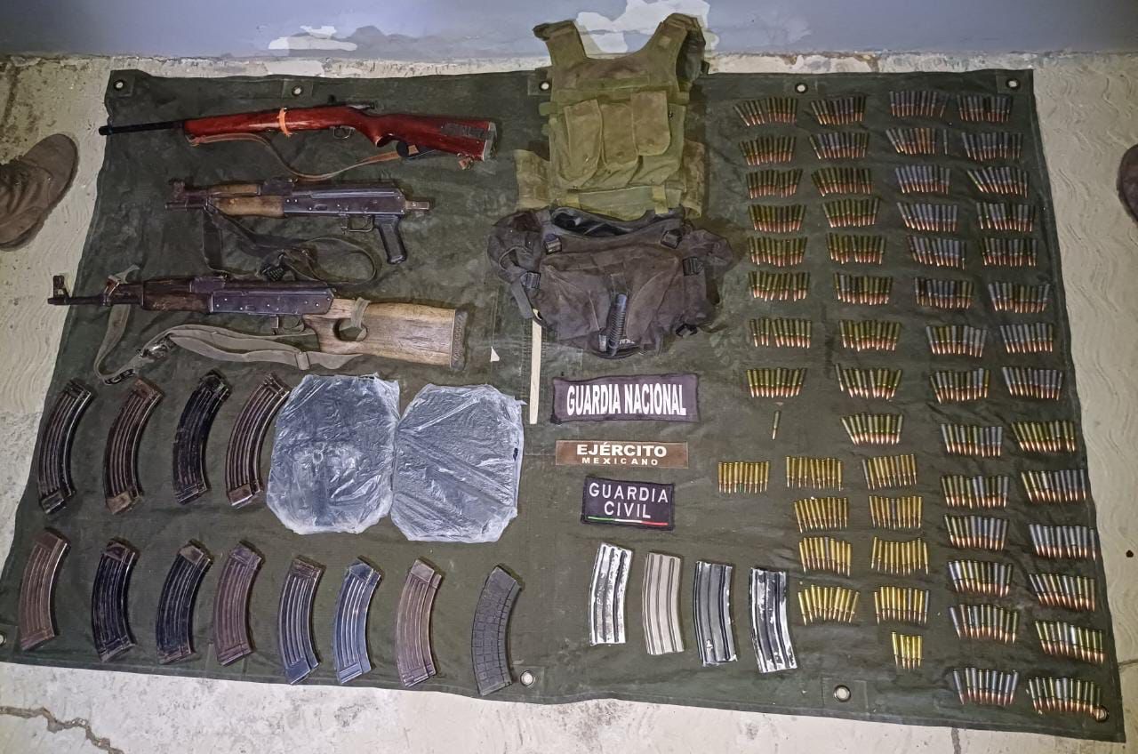 Apatzingán, Michoacán, 12 de junio del 2023.- A través de los trabajos coordinados, personal de las Guardias Civil y Nacional, con el Ejército Mexicano aseguraron un arsenal en el municipio de Apatzingán; hay un presunto implicado detenido, esto derivado de una agresión por parte de civiles armados.